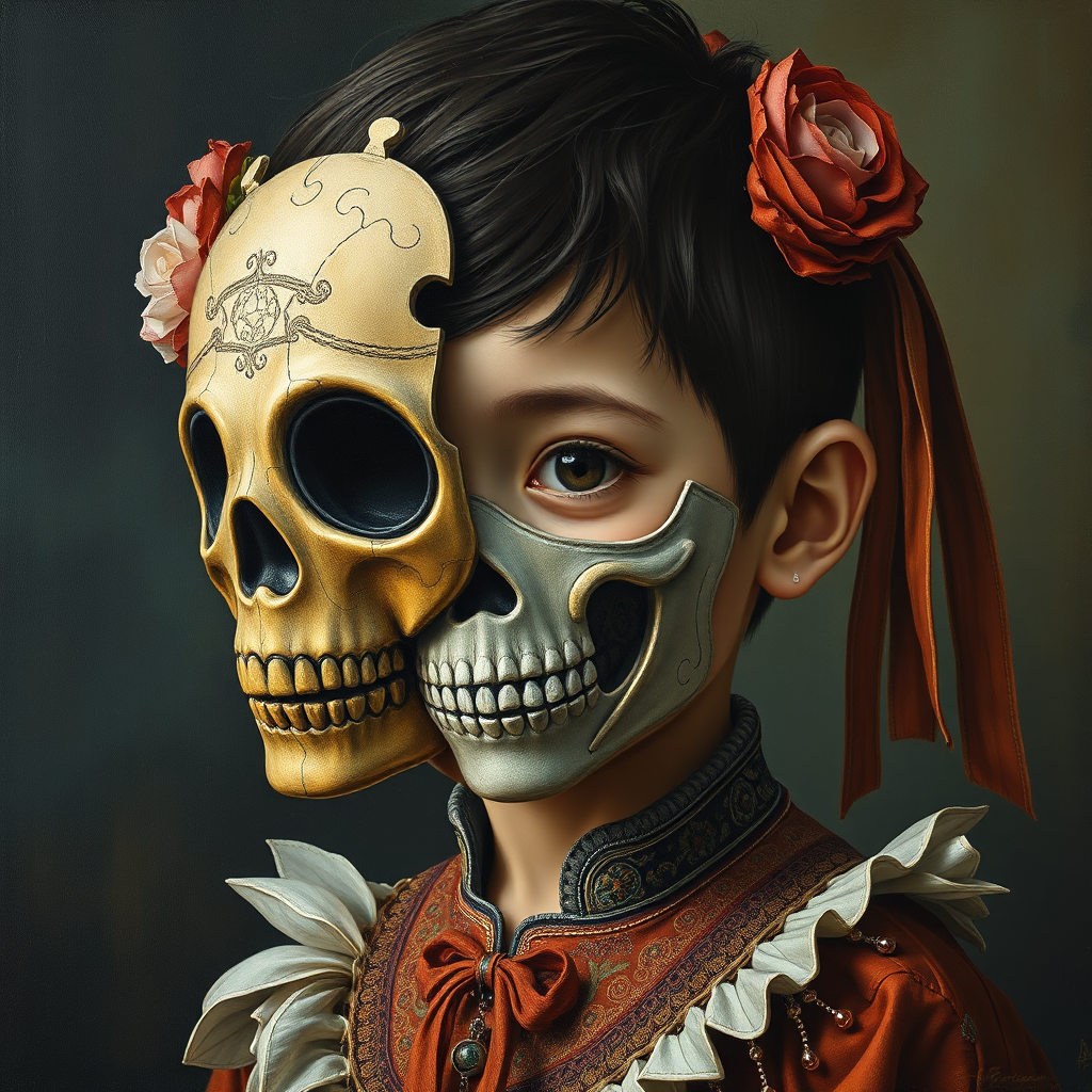 View this AI-generated image featuring a pop surrealism painting of a puzzle piece boy wearing a david alejandro inspired skull mask exuding childlike innocence and charm rendered in oil on panel with a flowerpunk aesthetic the scene is set in an interplay of dark navy and light bronze hues featurin