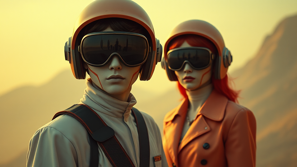 Surrealism photography, masquerade space travelers in 1960s-inspired attire, blending 1960s fashion with cyberpunk aesthetics, offering a vintage yet futuristic feel. The image captures a dreamlike, ultra-realistic cinematic scene reminiscent of a 1960s movie, utilizing technicolor effects. Shot with a 70mm lens, settings include ISO 400, f4, and 1/20 exposure, delivering 8K resolution. Dramatic lighting and depth of field create an atmospheric mood, with a cropped-frame composition adding a sense of imbalance. Despite high-resolution intent, the image features a washed-out, low-contrast appearance, suggesting a watermark or graphical imperfection. The scene appears cropped and out-of-frame, with intentionally poor image quality that evokes a sense of nostalgia and otherworldly charm through specialized creative techniques, polymorphic elements, and intentionally low resolution and drawing quality.