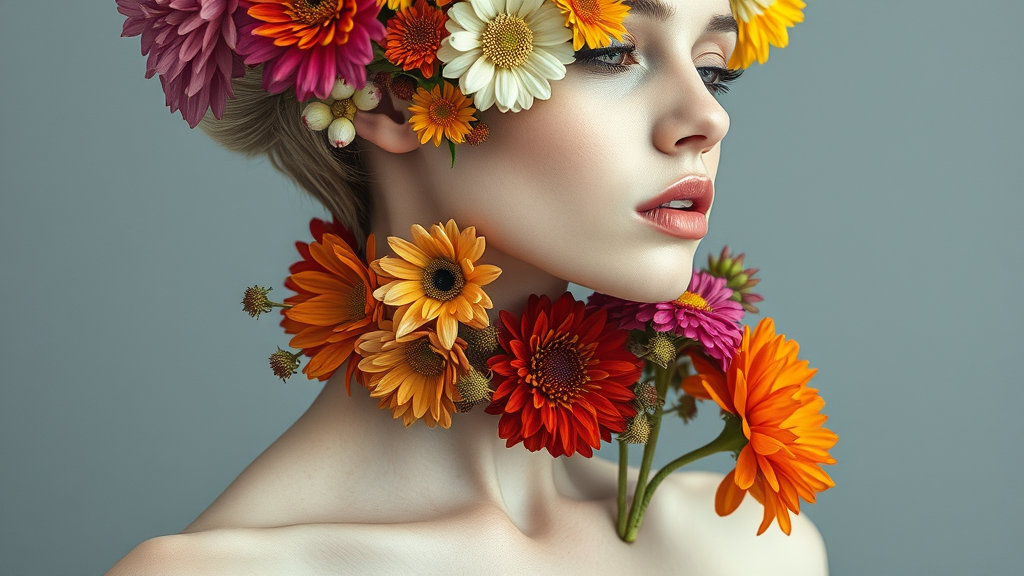 Surrealism theme master photography high-end gray background close-up of the upper body of a porcelain-skinned mushroom-headed short-haired beauty elegant neck and collarbone her face replaced by an eclectic bouquet of vividly colored flowers the image captures the intriguing fusion of floral elements and human form a striking balance of beauty and the uncanny.