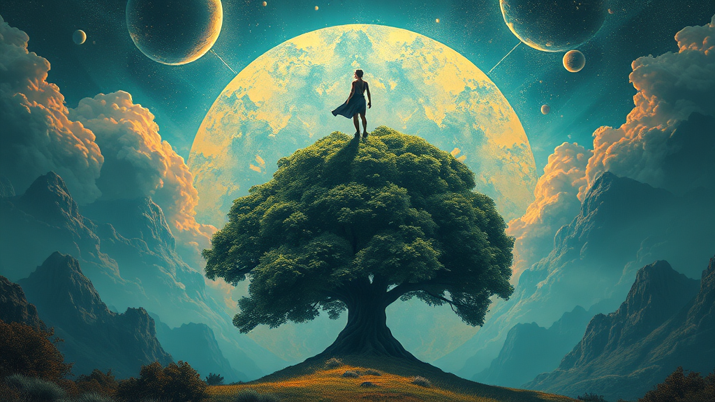 Surrealist depiction of a vast circle with a human figure hovering above a lush tree, set in a vibrant fantasy landscape. The scene exudes psychedelic and surreal elements, with melting forms in shades of teal and bronze. The composition is infused with dynamic energy, invoking a sense of hikecore and sublime wilderness. The visual is reminiscent of compelling poster art, leaving viewers in awe of its breathtaking beauty.
