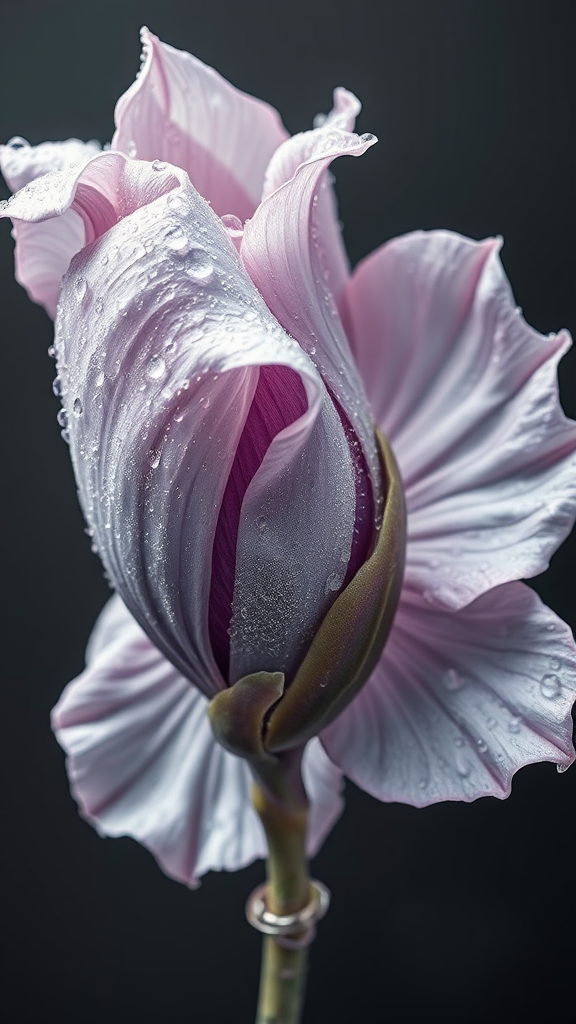 Surrealist depiction of dew-laden flower stem, infused with a Picasso-esque melting form, intertwining various textures, bathed in light silver and soft purple hues, showcasing intricate layers and dreamlike distortions with a harmonious balance of elegance and abstraction.