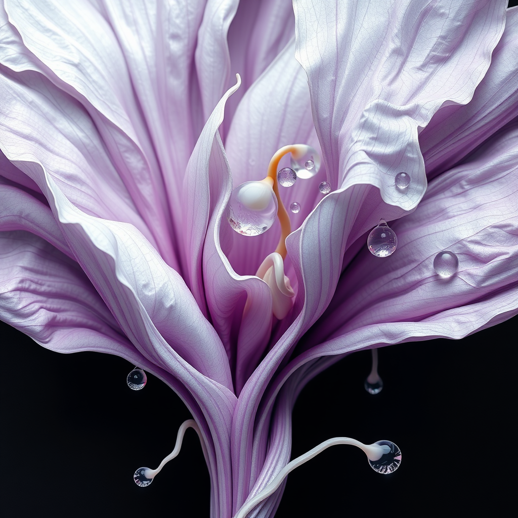 Surrealist depiction of flower stem with water droplets, inspired by Picasso, showcasing melting and intertwining textures in hues of light silver and purple, featuring intricate layers and dreamlike elements, creating a harmonious, abstract composition.
