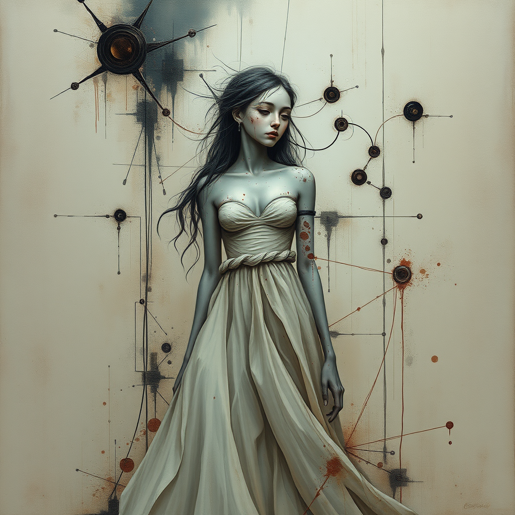 Surrealist expressionism inspired mixed media artwork featuring an emotional cyborg girl in an elegant, flowing dress. Her skin is adorned with intriguing lesions, serving as narrative elements that explore her inner world. The scene is steeped in a muted color palette, creating a dreamlike atmosphere with abstract, distorted forms that blend seamlessly into the background. The composition merges the human and the mechanical, capturing a sense of melancholy and ethereal beauty in a 2:3 aspect ratio.
