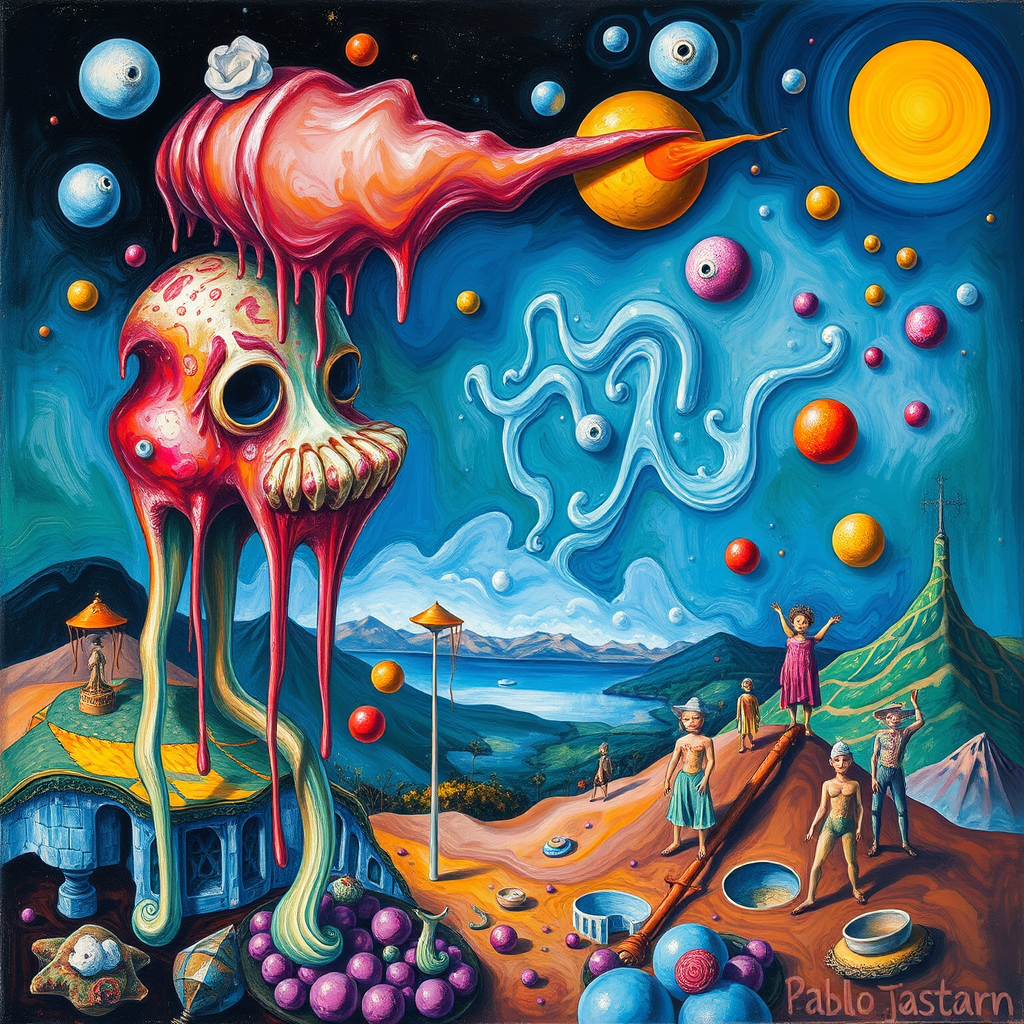 Surrealist painting by Pablo Picasso featuring imaginative and bizarre elements, with forms appearing to drip and melt, vibrant colors in a dreamlike composition, otherworldly figures intertwining with fluid landscapes, distorted yet captivating visual narrative, enigmatic and thought-provoking atmosphere.