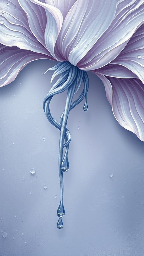 Surrealist painting depicting delicate water droplets cascading down the twisting stem of a flower, blending seamlessly with elements of Picasso’s surrealism. The scene features melting and intertwining materials, rendered in soft silver and light purple hues. Intricate layers create a dreamlike texture, capturing an ethereal balance between fluidity and structure, with a sense of perpetual transformation.