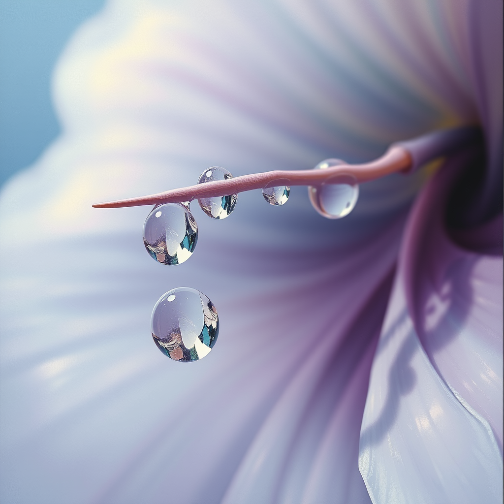 Surrealist painting depicting water droplets delicately balanced on a flower stem, merging elements of Picasso's abstraction and surrealism. The droplets appear to melt and intertwine with the stem, forming a harmonious dance of textures and forms. The scene is softly illuminated in hues of light silver and lavender, creating an intricate layering effect that suggests a dreamlike atmosphere. The artwork explores the fluid interplay of organic and abstract shapes in a visionary manner.