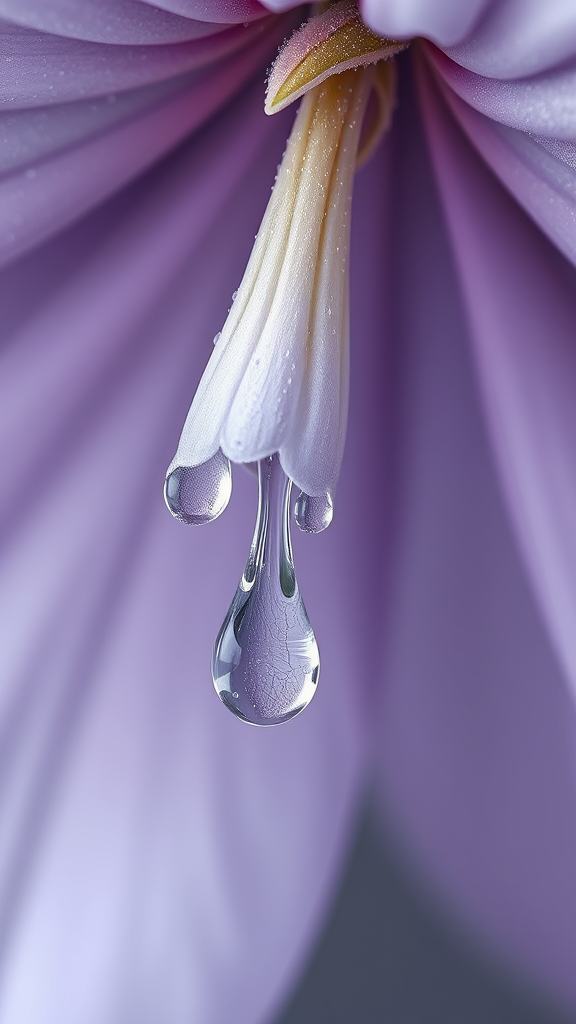 Surrealist painting featuring water droplets delicately suspended on a flower's stem, infused with the essence of Picasso's surrealism, where the elements appear to melt and seamlessly intertwine. The scene is bathed in a soft palette of light silver and light purple, showcasing intricate layering and textures that play with perception, creating a dreamlike ambiance with unexpected twists.