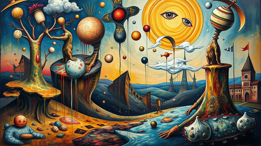 Surrealist painting, inspired by Pablo Picasso, features striking and bizarre images with elements that appear to be dripping and melting, showcasing a dreamlike landscape of distorted figures and vibrant colors, enhanced with whimsical and fragmented shapes that defy reality, evoking a sense of abstract mystery and creative fluidity.