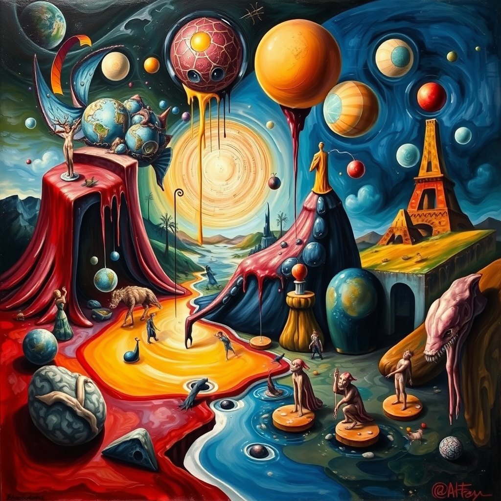 Surrealist painting inspired by Pablo Picasso, featuring striking and bizarre imagery with elements dripping and melting, vibrant colors and abstract forms intertwining, dream-like landscapes merging with distorted figures, an imaginative play of light and shadow creating a sense of fluidity and movement.