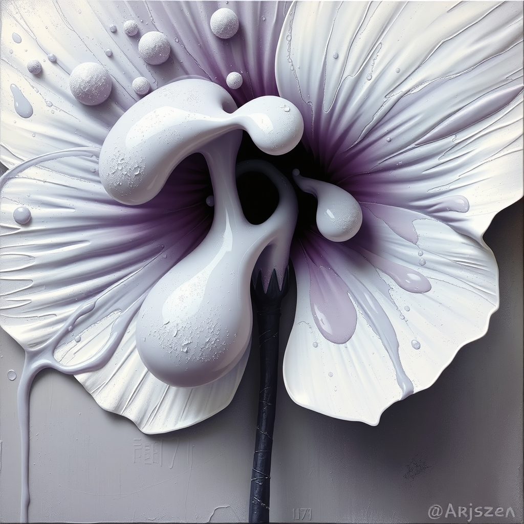 Surrealist painting of liquid-like droplets merging on a flower stem, reminiscent of Picasso, with forms melting and materials intertwining, highlighted by a palette of silver and light purple, featuring intricate layers and textures throughout the composition.