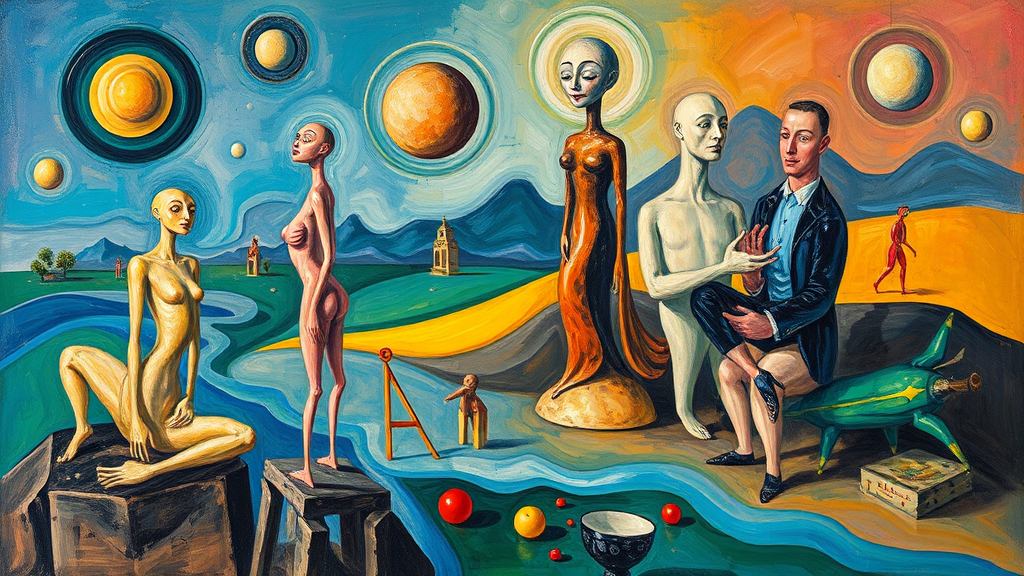 surrealist vision by Pablo Picasso, bold and unusual forms, melting figures, fluid and distorted shapes, vibrant colors blending seamlessly, dreamlike landscape, ethereal and otherworldly atmosphere, playful yet haunting elements, unexpected contrasts, imaginative abstraction