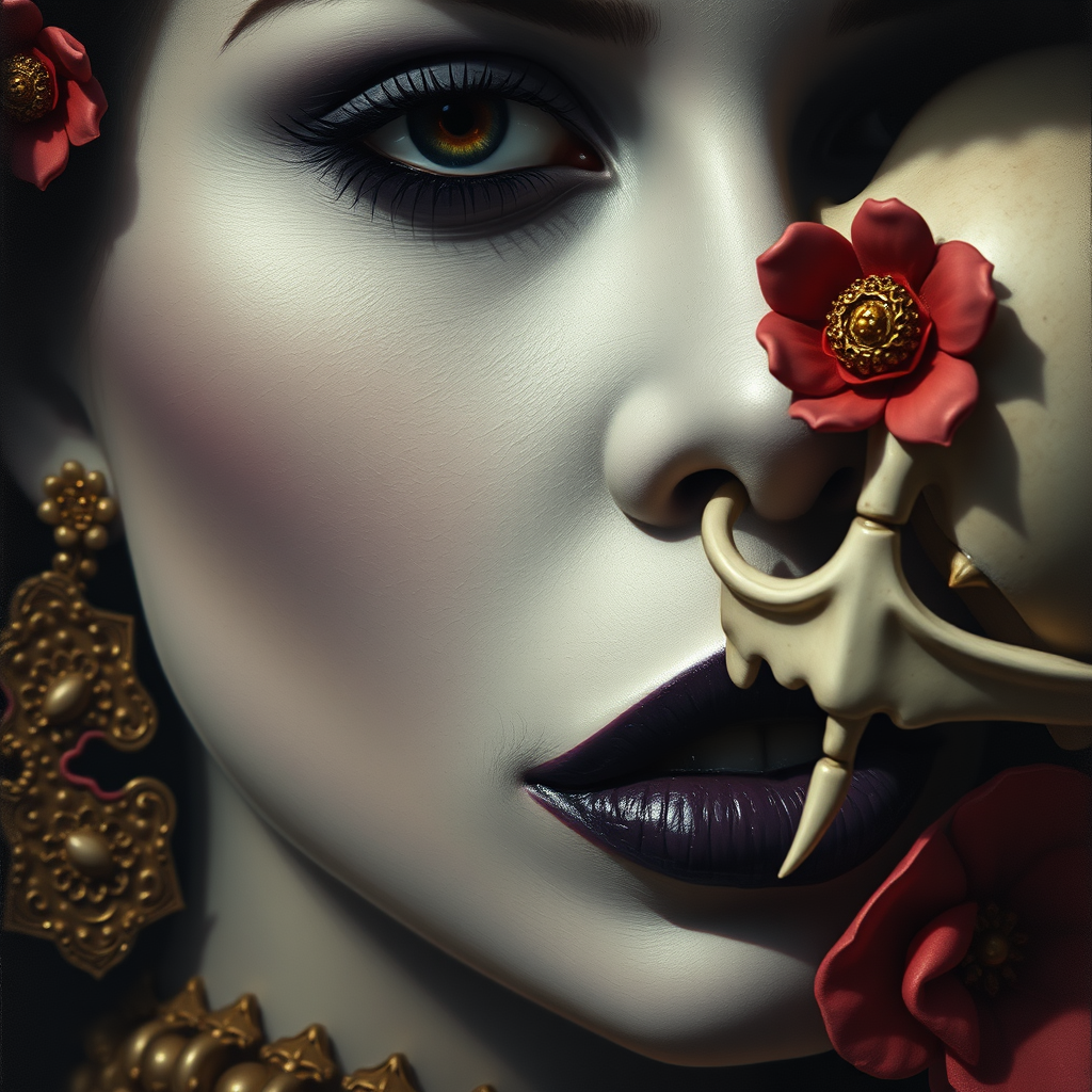 Surrealistic close-up painting of a woman with a skull, showcasing highly detailed and intricate facial features. The piece features dark purple lips and is adorned with elaborate Mexican ornamentals. The dramatic lighting casts shadows over her pale, monochrome complexion. Her expression is that of a lifelike puppet, yet her nose appears oddly malformed. Elements of mutation and dismemberment subtly weave into the composition, creating an eerie yet captivating atmosphere.