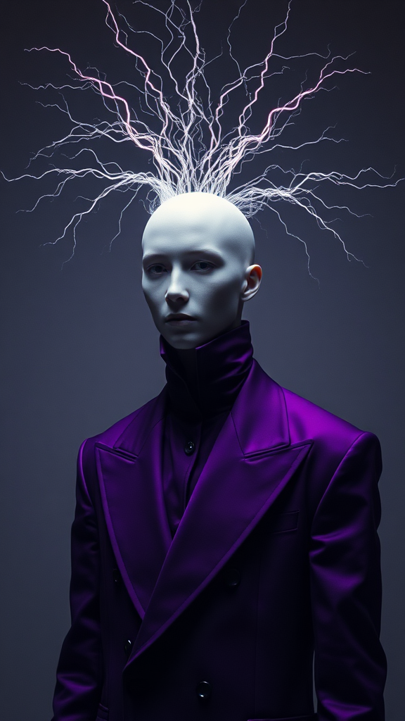 Surrealistic high-resolution scene featuring an enigmatic figure of unknown gender with an electromagnetic aura emanating from their head. The figure's face is a blank canvas, adding to the mystical mood. The avant-garde attire they wear is tailored in rich purple, striking yet harmonious against the minimalistic backdrop. The setting is enveloped in low-key lighting, enhancing the mysterious atmosphere and inviting interpretive exploration. The scene challenges perception with a reinterpretation of reality, characterized by creative technique, realism, and meticulous detailing.