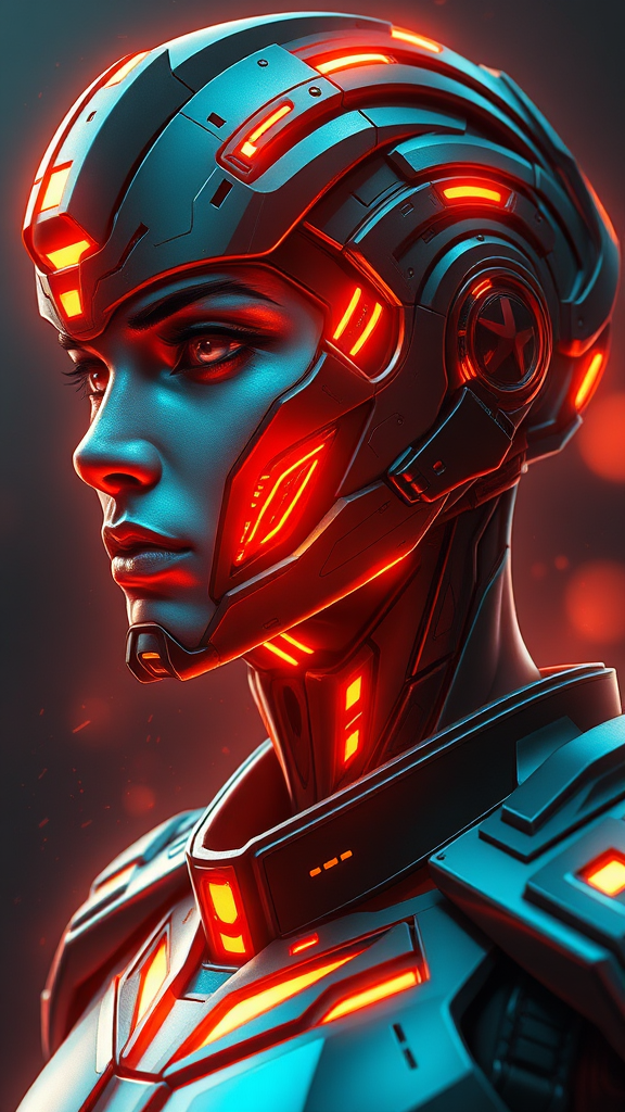 surrealisticart digital painting anime portrait of advanced military cyborg cyberpunk style warframe stealth mode armored neon glow character design hard surface sleek detailed facial features highly detailed intricate symmetry volumetric illumination ambient glow real-time rendering vfx digital 3d uhd hdr 3d side view incomplete frame flaws in art blurred disproportionate unappealing inaccurate anatomy distorted unattractive elongated neck partial head