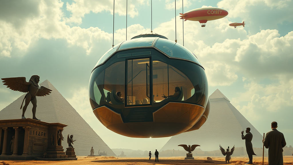 Suspended capsule house, floating above the ground, featuring an impressive front door and expansive glass windows, depicted in high detail with a cinematic and realistic style inspired by Fenghua Zhong, infused with an ethereal blur. The scene suggests a surreal twist with elements like extra limbs and fingers, added wings, and shadowy figures. Nearby, an Egyptian pyramid stands, accompanied by statues and text. In the sky, a pair of balloons and a dirigible complete the fantastical atmosphere.