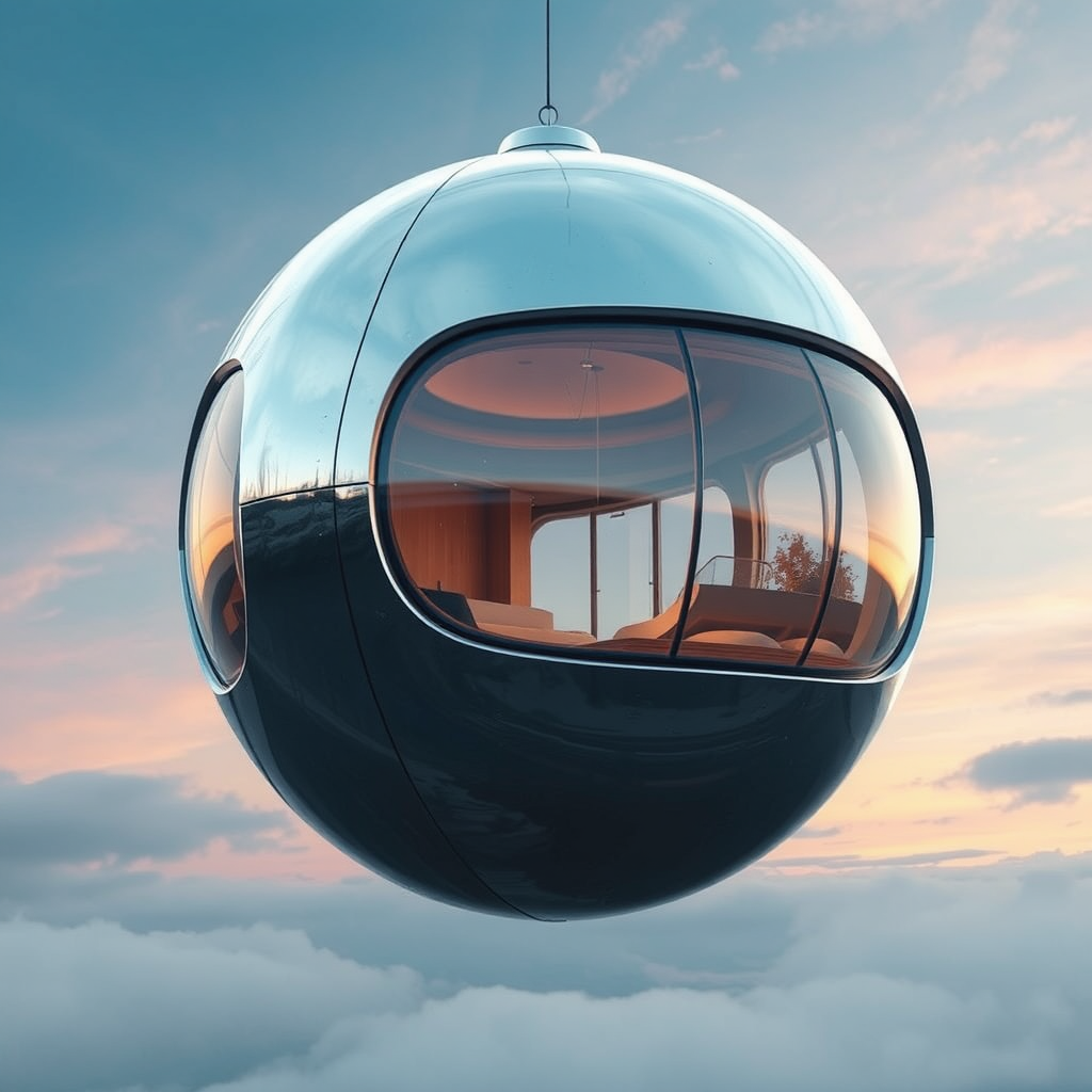 Suspended in the sky like a futuristic orb, the capsule house levitates above the earth, its gleaming aluminum surface reflecting the shifting hues of dawn and dusk as transparent panels offer panoramic views of the landscape below, and a soft hum of hidden technology holds it aloft with an air of serene defiance against gravity.