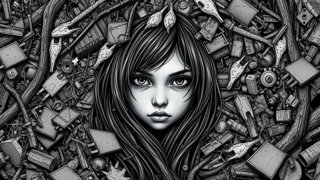 Swamplands drenched in endless rain, dense jungles entwined with waterlogged mysteries, a youthful pile elf girl emerges, her face the focal point amidst an overwhelming assortment of varied debris enveloping her like a deluge. Her youthful visage is shrouded in the tumultuous clutter that surrounds her, an evocative juxtaposition of innocence and chaos. The composition is thought-provoking, rendered in stark black and white, marred by poor execution with incorrect anatomy, misplaced and floating limbs, mutations, grotesque and distorted features, and blurred, oversaturated elements. A haunting yet striking depiction of beauty tangled in disorder.