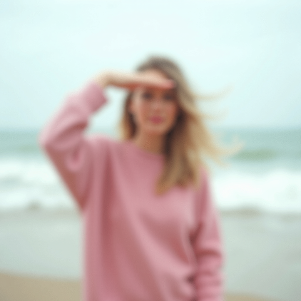 A woman in a pink sweater shields her eyes with one hand, standing on the beach as waves rhythmically crash against the shore. The brisk sea breeze tousles her hair, creating a sense of movement and freedom. Captured from afar, the scene carries a nostalgic film grain texture, reminiscent of 35mm film, styled in the rich tones of Kodak Portra 400T. The expansive ocean forms a serene horizon in the distance, while the motion of her pink sweater conveys a gentle blur, artfully blending the dynamic and still elements of the moment.
