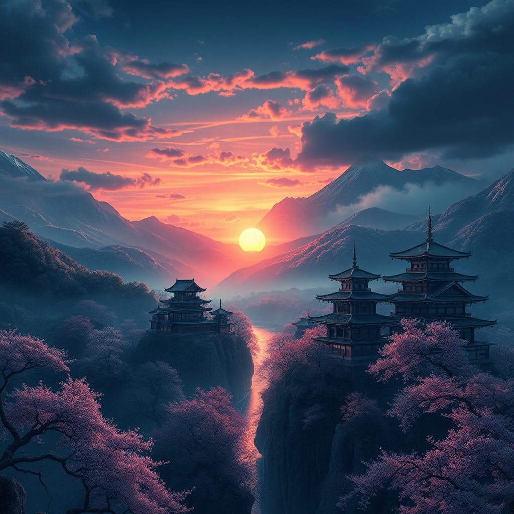 Sweeping view of a majestic Japanese landscape, infused with the inky elegance of a Kingdom Hearts style. The scene is bathed in dramatic, ethereal lighting, capturing the intricate details of traditional architecture nestled among lush cherry blossom trees and towering mountains. A serene river winds through the landscape, reflecting the vibrant colors of a setting sun. Rendered in stunning 8k resolution, the composition maintains a harmonious 3:2 aspect ratio, with subtle artistic embellishments enhancing the mystical atmosphere.