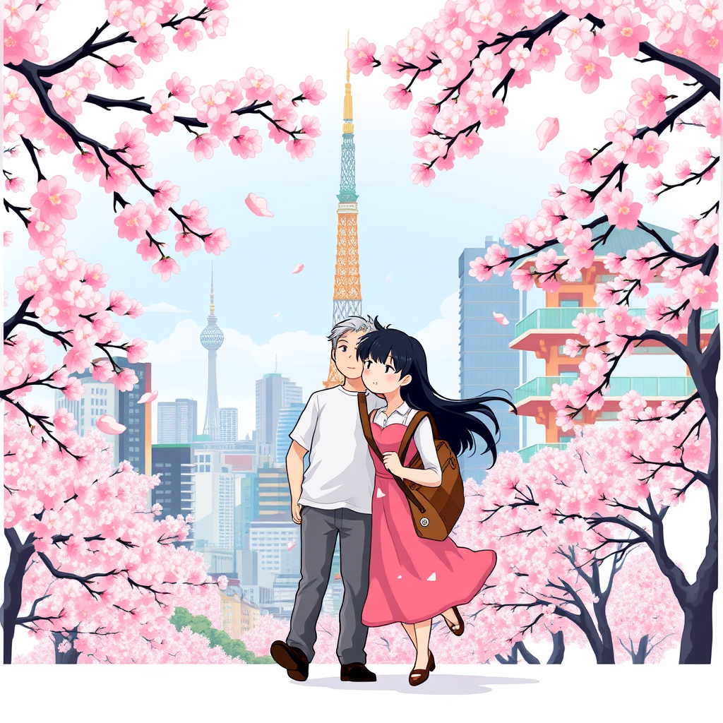 Sweetheart couple enjoying a summer trip in Tokyo, surrounded by sakura blossoms, captured in a pixel art style reminiscent of Studio Ghibli. The design features them in harmony with the city's enchanting balance of nature and urban space, perfect for a t-shirt illustration. Set against a white background, this ultra high-quality artwork emphasizes love, adventure, and the beauty of Japan's cherry blossoms.