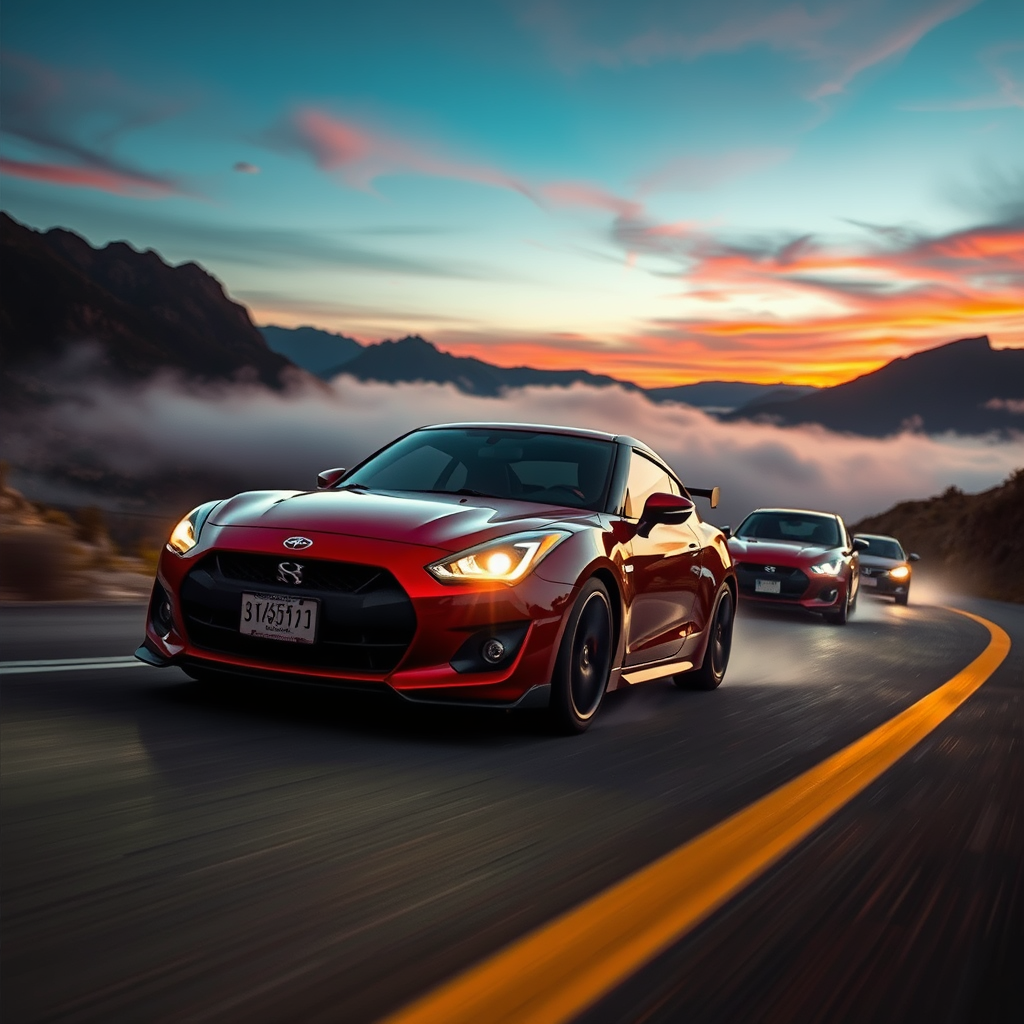 Swift Racing through Serpentine Mountains, dusk settles with fiery hues, engines roaring, headlights slicing through misty veils, adrenaline-fueled precision, Takashi at the helm, mastery of curves, harmonious dance of machine and man, landscape blurred, whispers of wind, wheels grip the asphalt with relentless fervor.