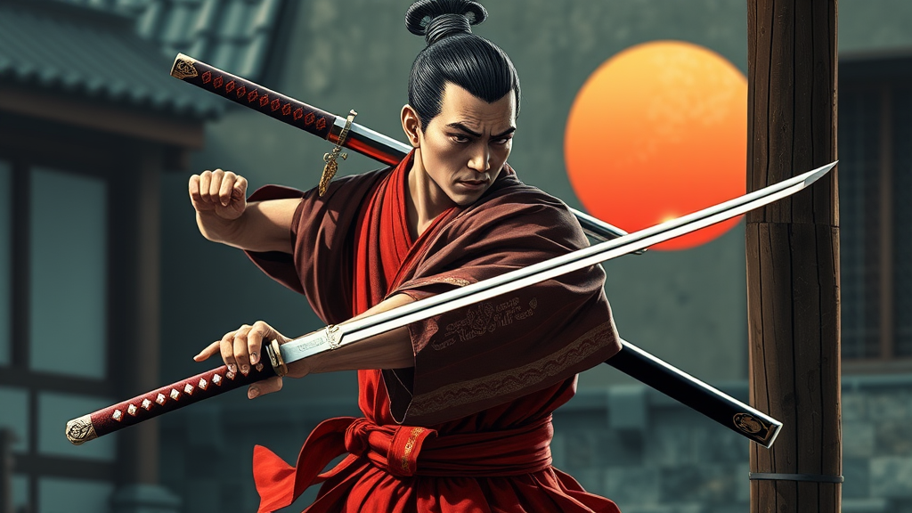 Sword across shoulder, wielding kodachi, gripping the blade, leaning on laundry pole, holding the sheath, arm blade ready, ensis exorcizans in focus, intricate tsuba, styled mizura, poised samurai, in battoujutsu stance, using sword cane, adopting sunrise stance, bearing tachi, adorned in red hakama, firm tsuka, invoking yukianesa, wielding seven-branched sword, spinning weapon artfully, entwined in kouhaku nawa, evoking aura — malformed, kitsch, overly vibrant, loaded with grain, low-resolution, deformed anatomy, blurred visage, awkward mutation, superfluous limb, aesthetically poor, loosely rendered hands, absent limb, hazy, arbitrary limbs, disjointed limbs, flawed hands, softness, lack of focus, extended neck, stretched physique, unattractive, unsightly, sketchily drawn, juvenile, fragmented, corrupted, surreal aspects, scripted, blurred, grayscale, monochromatic, conjoined entities, multiple faces, excess limbs, mutated stance, contorted, bizarre fashion, internet meme style, distorted, protracted, warped, misaligned, heterochromatic gaze, closed, hazy, watermark presence.