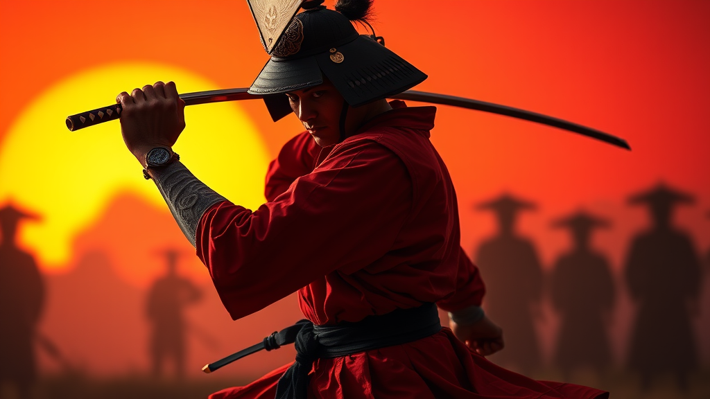 Sword over shoulder, holding a kodachi with confidence, poised with intent in a battoujutsu stance. A traditional samurai in vibrant red hakama, guided by the spirit of yukianesa. The intricate tsuba gleams under the soft light, matched by the elegance of a well-balanced tachi. Twirling a sword cane between dexterous fingers, the samurai embodies the essence of the ensis exorcizans. The vivid sunrise stance is accentuated by the mystique of the seven-branched sword, ready for the dance of battle. The silhouette reflects on the artful struggle between tradition and modernity. However, the scene blurs into oversaturated chaos—muted outlines, fragmented anatomy with a surreal twist, like a kitsch painting gone awry. Limbs float in disarray, and faces misshape in a dizzying blur, conjuring images of twisted beings and mutated forms. A disfigured mirage, where textures bleed into each other, leaving a lingering sense of eerie fascination with the grotesque. It's an abstract fusion of order and chaos; beauty overshadowed by distorted reality, a juxtaposition of the martial and the malformed.