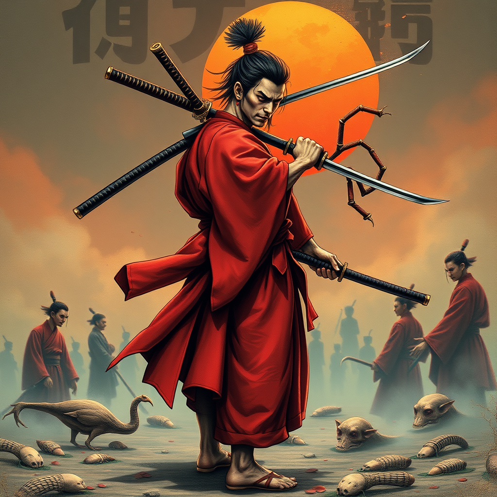 Sword over shoulder, kodachi, holding sword, laundry pole, sheath held tight, arm blade, ensis exorcizans, intricate tsuba design, mizura hairstyle, samurai in battoujutsu stance, sword cane in hand, graceful sunrise stance, tachi ready for action, striking red hakama, detailed tsuka craftsmanship, mysterious yukianesa, seven-branched sword twirling skillfully, unique kouhaku nawa technique. Amidst a surreal blend of disfigured and kitsch elements, oversaturated and grainy textures, low-res aesthetics, and deformed figures with blurry appearances. Featuring bad anatomy, with disfigured, poorly drawn faces, and mutant-like features, such as extra limbs and ugly distortions. Depictions include poorly drawn hands, missing limbs, and blurry floating limbs. Disconnected and malformed hands, out-of-focus details, and exaggerated long necks and bodies. An uncanny presentation that's both surreal and ugly, with a poorly drawn, childish quality. Mutilated and mangled forms, with old and surreal text elements, and monochrome pieces revealing conjoined twins, multiple heads, extra legs, and arms. A fusion of fashion photos and meme culture, with deformed and elongated features, twisted fingers, strabismus, heterochromia, closed eyes, and blurred effect. Watermarked impressions add to the chaotic scene.