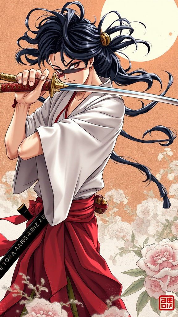 Sword poised on shoulder, holding kodachi, gripping sword and sheath like laundry poles, arm blade in play, crafted ensis exorcizans, intricate tsuba, flowing mizura hairstyle, samurai essence in battoujutsu stance, balancing with sword cane in the first light of sunrise stance, wearing red hakama, gripping tsuka, invoking the spirit of yukianesa, brandishing a seven-branched sword, expertly twirling weapon, wrapped with kouhaku nawa. Avoid disfigured, kitsch, oversaturated imagery. Maintain clarity, avoid grain or low-resolution details, ensure correct anatomy, and maintain focus for a piece that is well-drawn and cohesive. eschew elements like overly elongated features, additional limbs, or any blurred, deformed, or unattractive aspects. The result is a composition focused on elegance and detail, highlighting a seamless and skillful depiction without surreal features or distracting elements.