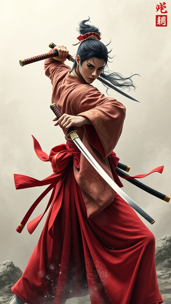 Sword resting on shoulder, wielding a kodachi, poised with sword in hand, mimicking a laundry pole, gripping the sheath, arm embellished with a blade, executing a battoujutsu stance. Adorned in a sunrise stance, equipped with a sword cane. Clad in red hakama, engaging with the ensis exorcizans, orbiting a seven-branched sword. Sporting a tachi with an intricate tsuba, embracing the elegance of mizura, reflecting a samurai spirit. Celebrating the art of kouhaku nawa and the essence of yukianesa. Despite vivid imagery, avoid deformations: excess limbs, distorted visuals, blurred focus, or flawed anatomy. Maintain clarity, elegance, and historical authenticity, steering clear of exaggerated mutations or overblown characteristics, ensuring a captivating, harmonious portrayal.