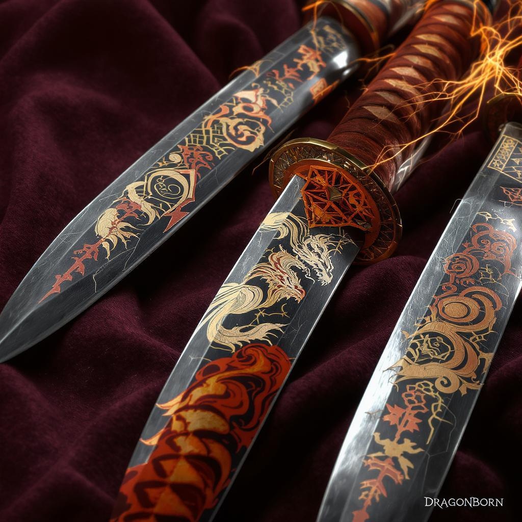 Swords of the dragonborn embedded with intricate neo-traditional Japanese designs, showcasing the artistry of Magali Villeneuve and Xiaofei Yue, close-up intensity that captures the urban and edgy essence, wrapped in dark crimson and vibrant orange tones, exuding the raw energy and power of traincore, a perfect blend of classic craftsmanship and contemporary flair.