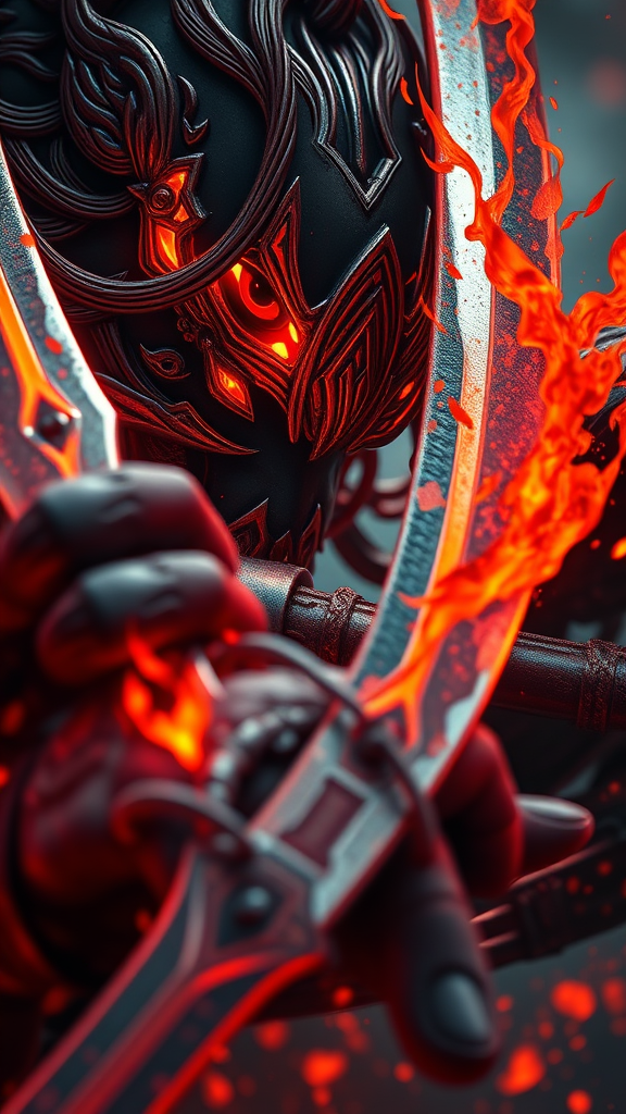 Swords of the dragonborn, neo-traditional Japanese style, inspired by Magali Villeneuve, intense close-up, urban edge, Xiaofei Yue influence, deep crimson and fiery orange hues, traincore atmosphere, heightened detail and drama, dynamic and mystical energy, focused composition, 72:95 aspect ratio, sharp and vivid storytelling elements.
