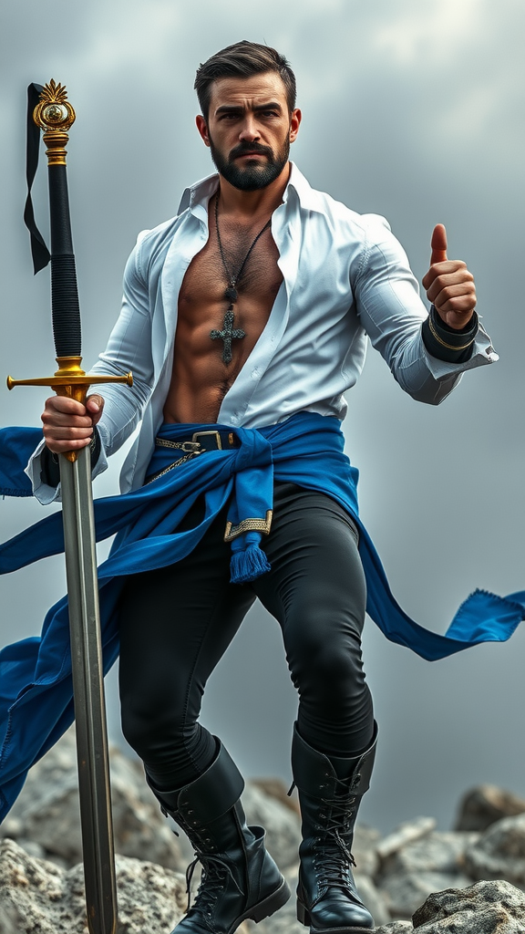 Swordsman, guardian, soldier of a good and righteous King. Hypermasculine male. Caucasian male, Russian origin. Tall, muscular, sinewy, strong, broad chested, wide shouldered, narrow waist. Extremely hairy, hirsute body {{{ thick coarse hair on chest ,abs, arms,legs}}} Pale grey eyes, handsome masculine face, strong brow, chiseled chin with dimple, slight thin black mustache. Short black hair with silver streak up front, wavy fade hairstyle with curls pushed to one side {{{SHORT HAIR}}}. Silky sheer white long sleeved collared shirt, unbuttoned to his navel to reveal his hairy chest. Long, loose sleeves above hairy wrists. Cross pendant with sapphire sliver chain around the neck. Long royal blue sash around the waist, flowing in the wind. Shiny formfit black tights/pants, legs powerful and muscular. Pants tucked into black leather pirate boots, boots adorned with silver metallic designs. Black belt strap across his chest, holding a sapphire jeweled bastard sword. Swordsman fighting stance, full body pose. {{{VERY HAIRY CHEST}}}