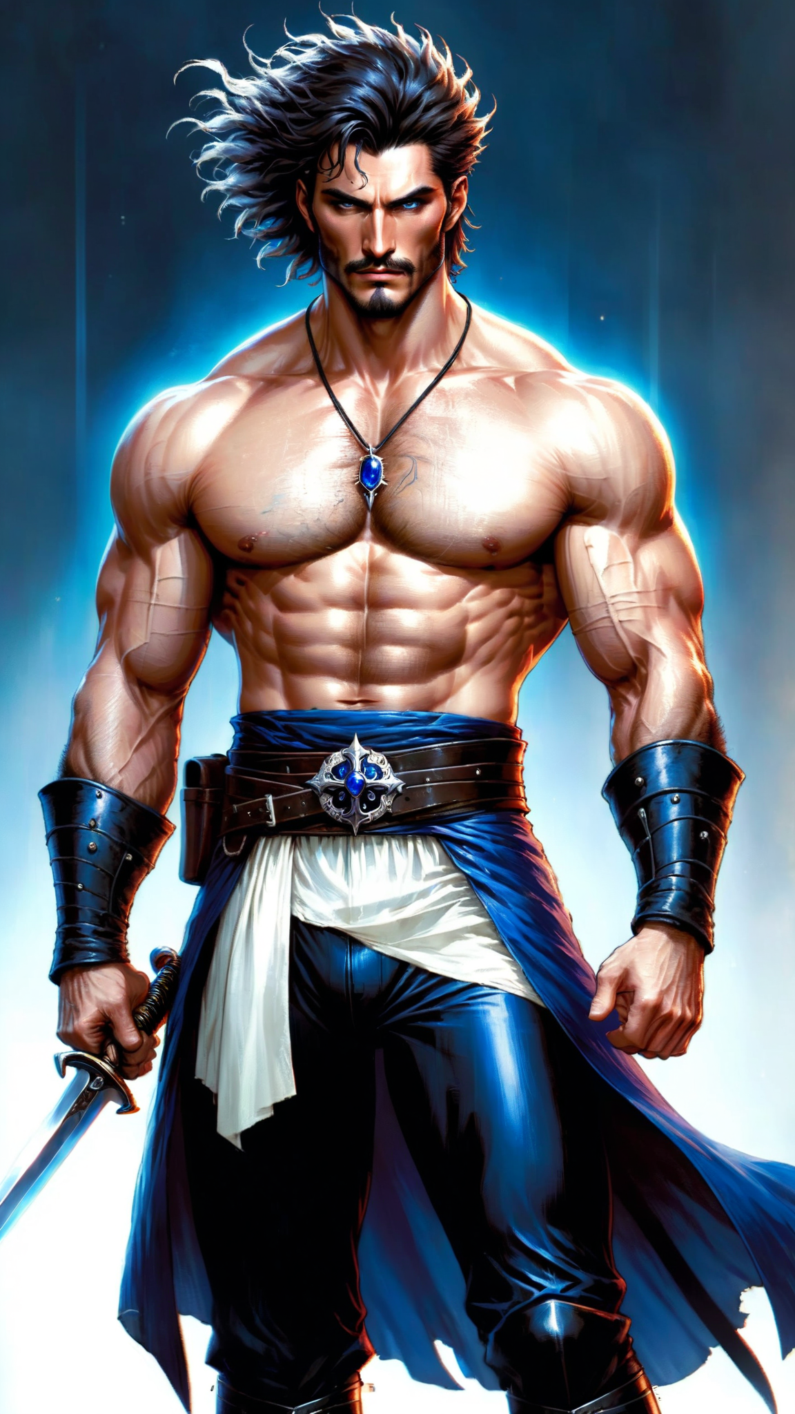 Swordsman, guardian, soldier of a good and righteous King. Hypermasculine male. Caucasian male, Russian origin. Tall, muscular, sinewy, strong, broad chested, wide shouldered, narrow waist. Extremely hairy, hirsute body {{{ thick coarse hair on chest ,abs, arms,legs}}} Pale grey eyes, handsome masculine model face, strong brow, chiseled chin with dimple, slight thin black mustache. Short black hair with silver streak up front, wavy fade hairstyle with curls pushed to one side {{{SHORT HAIR}}}. Silky translucent sheer white long sleeved collared shirt, unbuttoned to his navel to reveal his hairy chest. Long, loose sleeves above hairy wrists. Cross pendant with sapphire sliver chain around the neck. Long royal blue sash around the waist, flowing in the wind. Shiny formfit black tights/pants, legs powerful and muscular. Pants tucked into black leather pirate boots, boots adorned with silver metallic designs. Black belt strap across his chest, holding a sapphire jeweled bastard sword. Swordsman fighting stance, full body pose. {{{VERY HAIRY CHEST}}}