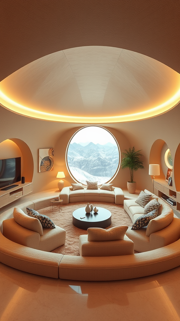 sxnfv style, 70s-inspired sunken living room conversation pit, retrofuturism meets mid-century modern interior design, surreal 3d dreamy 8k blender architecture render, warm beige and soft earth tones, curved lines and organic shapes, subtle ambient lighting, plush seating with textured fabrics, futuristic accents with a nostalgic twist