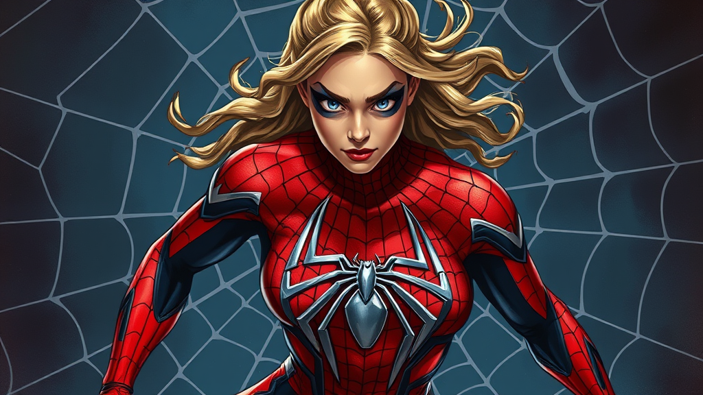 Sydney Sweeney as a dynamic Spider-Woman, wearing a stunning and intricately designed Spider-Man costume, featuring a highly detailed and artistic spider logo at the center. The full body shot captures her athletic and fitness-oriented physique, while her expressive face, complete with detailed eyes, conveys strength and determination. The composition emulates a digital painting style, inspired by artists like Artgerm, Greg Rutkowski, and Alphonse Mucha, ensuring the illustration remains smooth and sharp-focused. The background is an intricate spider web design, adding depth and texture to the scene, all rendered in high definition without any blur.