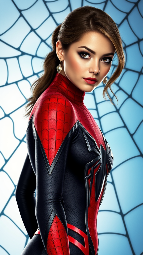 Sydney Sweeney as a stunning Spider-Woman, standing in a majestic pose, clad in a sleek black and red full-body Spider-Man costume, with a near-nude tone that accentuates her fit physique. The suit's design is a mix of classic Spider-Man style with a bold, feminine twist, complete with intricate details and texture. Sydney's face is turned slightly to the side, showcasing her eyes, nose, and lips in crisp, high-definition detail. Her eyes, a deep shade of brown, sparkle with determination and inner strength. Her face is lit with a soft, natural glow, conveying a sense of vulnerability and relatability. The skin is smooth and flawless, with a subtle sheen that hints at her hard-earned physical conditioning. The Spider logo on her chest is a masterpiece of digital painting, with thick lines, bold shapes, and a metallic sheen that seems to dance in the light. The background is a gorgeous web of black and white strands, set against a soft, gradient blue that evokes the magic and mystery of the Spider-Verse. The art style is a perfect blend of Artgerm's sleek, pop art flair and Greg Rutkowski's photorealistic, cinematic quality, with a dash of Alphonse Mucha's elegant, Art Nouveau sensibility. The overall effect is a breathtaking, high-beyond-high-definition shot that puts Sydney Sweeney's majestic beauty and Spidey's iconic style on full display.