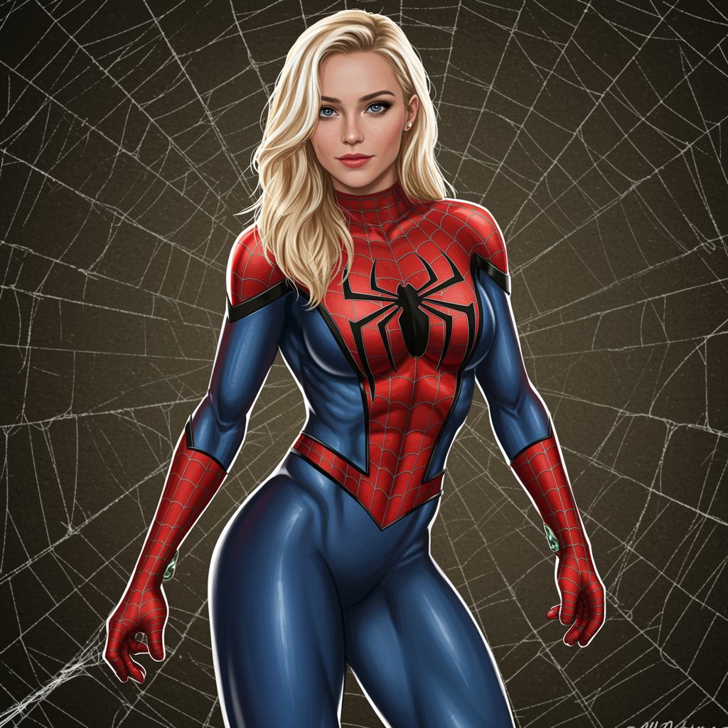 Sydney Sweeney as Spider-Woman in a custom Spider-Man suit featuring a detailed spider logo, showcasing a fitness body with a beautifully detailed face and expressive eyes. The scene captures a full-body shot against a backdrop of intricately woven spider webs. The artwork is a digital painting, characterized by its high definition, clarity, and smooth finish, with sharp focus and vibrant detail. Inspired by the artistic styles of Artgerm, Greg Rutkowski, and Alphonse Mucha, the composition reflects a blend of concept art and illustration, with a nod to classic and modern aesthetics.