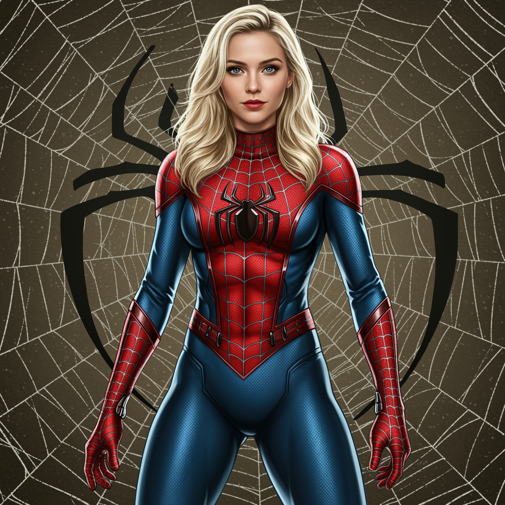 Sydney Sweeney as Spider-Woman in a meticulously crafted Spider-Man suit, featuring a distinctive and detailed spider logo on the costume. A full body shot highlights her fitness physique and beautifully captured facial features, with expressive and detailed eyes. The image is rendered in high definition, free of any blur, and showcases the suit's intricate design. This digital painting is influenced by the styles of Artgerm, Greg Rutkowski, and Alphonse Mucha, creating a smooth, sharp focus illustration suitable for concept art and ArtStation display. The background is an intricate spider web, seamlessly blending with the composition's detailed artistry.