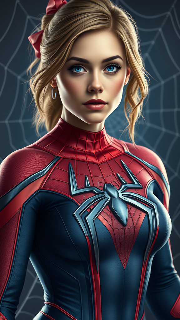 Sydney Sweeney as Spider-Woman in a sleek Spider-Man suit, featuring a full body shot that highlights her fitness physique. The costume showcases a highly detailed spider logo on the chest, with intricate web patterns throughout the fabric. Her face is real and beautiful, exhibiting detailed eyes and sharp facial features. This digital painting is rendered in HD with stunning clarity, capturing a smooth, sharp focus. The background features a delicate spider web, adding depth and context to the scene. The artwork is inspired by the styles of Artgerm, Greg Rutkowski, and Alphonse Mucha, combining concept art and illustration with elegance and meticulous detail.