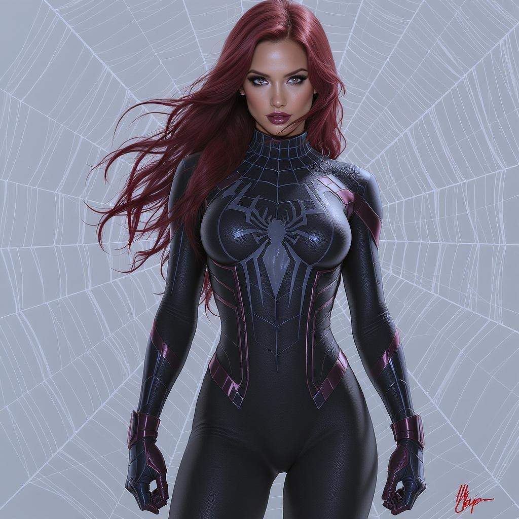 Sydney Sweeney as Spider-Woman in a sleek suit, inspired by Spider-Man's iconic costume, showcasing a full body shot with a beautifully detailed face and expressive eyes. The intricate spider logo is emblazoned on her costume, highlighting a fitness-enhanced physique. The digital painting captures her stunning features in high definition, maintaining sharp focus and vivid details. Influenced by the artistic styles of Artgerm, Greg Rutkowski, and Alphonse Mucha, the illustration presents a captivating concept art piece set against a backdrop of a delicate spider web, blending artistic flair with a touch of originality.