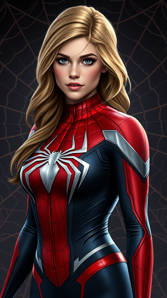 Sydney Sweeney as Spider-Woman in a Spider-Man inspired costume, featuring a full body shot with detailed face and expressive eyes. Her real, beautiful face and fitness body are highlighted in sharp focus, HD quality, without blur. The costume is adorned with a meticulously designed spider logo. This digital painting embraces Artstation-style concept art with influences from Artgerm, Greg Rutkowski, and Alphonse Mucha, set against a backdrop of intricate spider webs, showcasing a smooth, highly detailed illustration.