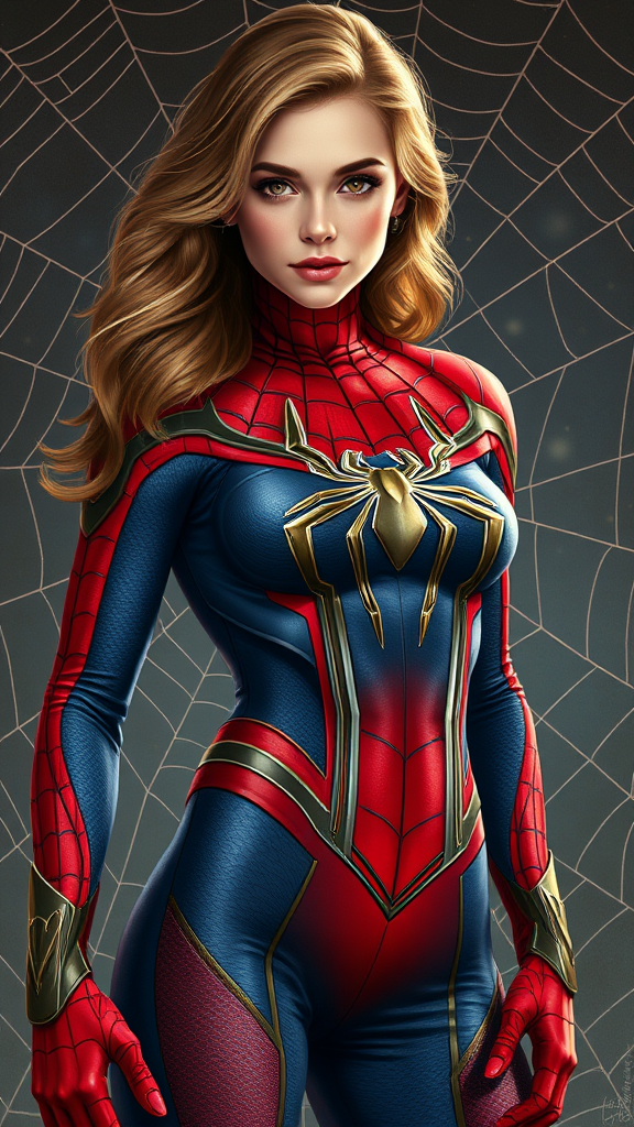 Sydney Sweeney dressed as Spider-Woman, wearing a highly detailed Spider-Man-inspired suit, full body shot showcasing her fitness body and beautiful face. The costume features a detailed spider logo, vibrant colors, and intricate web patterns. Her face and eyes are portrayed with meticulous attention to detail, capturing a lifelike expression. The digital painting style combines influences from artgerm, greg rutkowski, and alphonse mucha, with a smooth, sharp focus illustration. She stands against a background of a delicately woven spider web, creating a dynamic composition that blends elegance and strength.