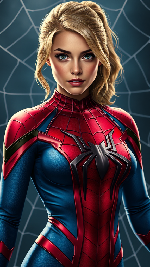 Sydney Sweeney in a Spider-Woman suit, inspired by a Spider-Man costume, showcasing a full body shot with a detailed and expressive face, striking detailed eyes, and a fitness-focused body. The composition features a beautifully rendered face, HD clarity, with sharp focus and no blur. The costume bears a meticulously designed spider logo, highlighted in a highly detailed digital painting style. The illustration leans into the realms of concept art, drawing influence from ArtStation-quality aesthetics, with smooth lines and sharp focus. The art is reminiscent of works by Artgerm, Greg Rutkowski, and Alphonse Mucha, set against a striking spider web background.