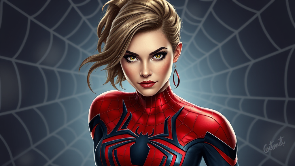 Sydney Sweeney portrayed as Spider-Woman in a sleek and form-fitting Spider-Man costume, featuring a highly detailed spider logo. Her face is realistic and captivating, with striking, expressive eyes and a flawless complexion. She exudes fitness with a toned physique, captured in a full-body shot. The digital painting is in high definition, with sharp focus and no blur, showcasing the beauty and detail of her costume. This artwork is inspired by ArtStation concept art and influenced by the styles of Artgerm, Greg Rutkowski, and Alphonse Mucha. Set against a backdrop of intricate spider webs, the piece combines smooth, highly detailed illustration with a touch of creative flair, maintaining the essence of a powerful and elegant superheroine.