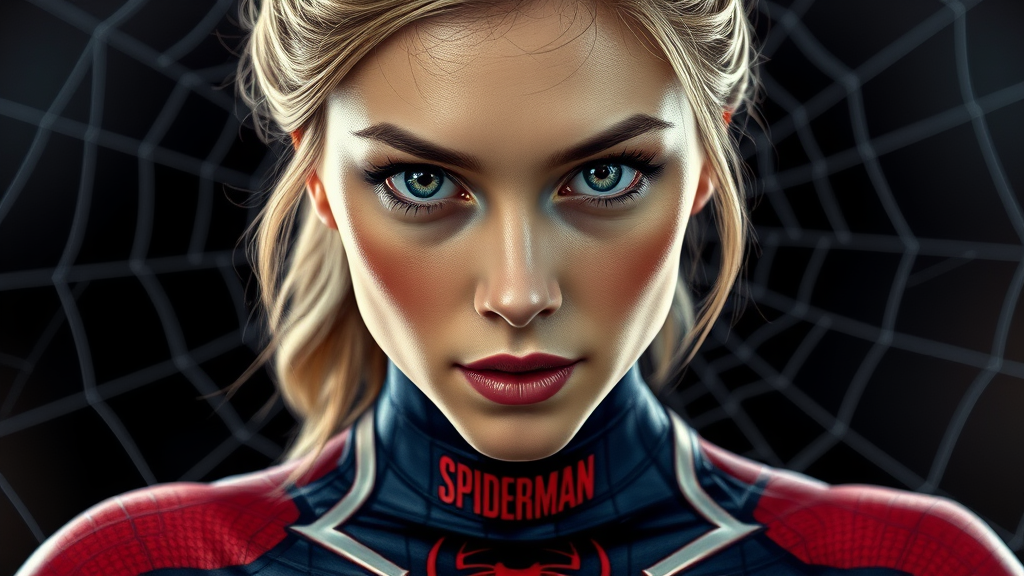 Sydney Sweeney wearing a Spider-Woman suit inspired by the Spider-Man costume, showcasing a full body shot with a focus on detailed and expressive eyes, capturing her real and beautiful face. Her fitness body is highlighted in this HD digital painting, with sharp focus and high detail, including a meticulously crafted spider logo on the costume. The artwork, reminiscent of ArtStation concept art, features influences from artists like Artgerm, Greg Rutkowski, and Alphonse Mucha, set against a background of intricate spider webs.