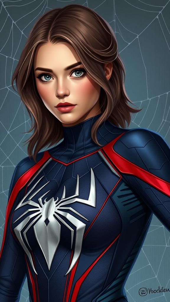 Sydney Sweeney wearing a suit as Spider-Woman, inspired by Spider-Man's iconic costume, showcasing a full-body shot with a detailed and expressive face, captivating eyes, and a fit physique. Her outfit features a prominent, intricately designed spider logo, and the image is rendered in high definition without any blurriness. The digital painting captures the essence of artstation concept art with influences from Artgerm, Greg Rutkowski, and Alphonse Mucha, all set against a backdrop of delicate spider webs. The overall composition is smooth and sharply focused, creating an illustration that's both vivid and strikingly beautiful.