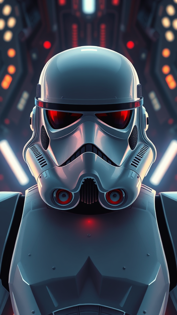 Symmetrical portrait of a Stormtrooper from Star Wars, set in a sci-fi universe. The character is illuminated by glowing lights, designed with intricate and elegant detail in a digital painting style. The piece exhibits a smooth and sharp focus, reminiscent of Artstation concept art. It draws inspiration from the works of Artgerm, Greg Rutkowski, and Alphonse Mucha, maintaining a balance between elegance and complexity. The artwork avoids elements such as low quality, text errors, or any distortions, focusing on accurate anatomy and proportions. The Stormtrooper is depicted with a classic helmet and armor, embodying strength and precision, without any deformities or visual clutter.