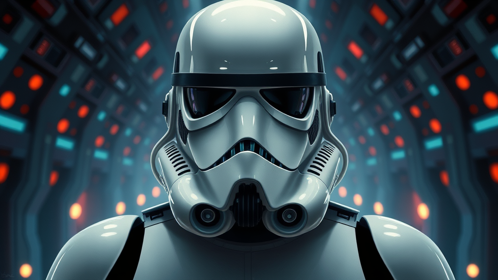 Symmetrical portrait of a stormtrooper in a star wars, sci-fi setting featuring glowing lights. The piece is an elegant, intricate digital painting, showcasing a highly detailed, smooth, and sharply focused illustration. The artwork is inspired by the styles of Artgerm, Greg Rutkowski, and Alphonse Mucha, emphasizing concept art quality. Avoid elements like low resolution, text errors, poor quality, and deformities such as extra limbs or disfigured anatomy, ensuring the focus remains on the beauty and detail of the character and scene.