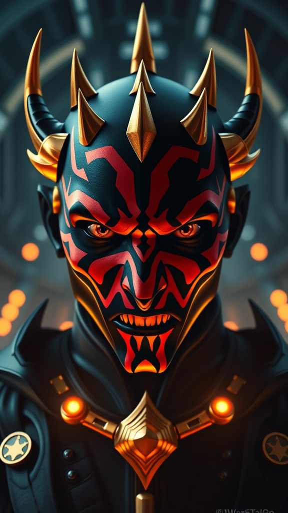 Symmetrical portrait of Darth Maul in gold and black, set in a Star Wars-inspired sci-fi universe, featuring glowing lights. Elegant and highly detailed, reminiscent of an intricate photograph on ArtStation, with a touch of creative flair.